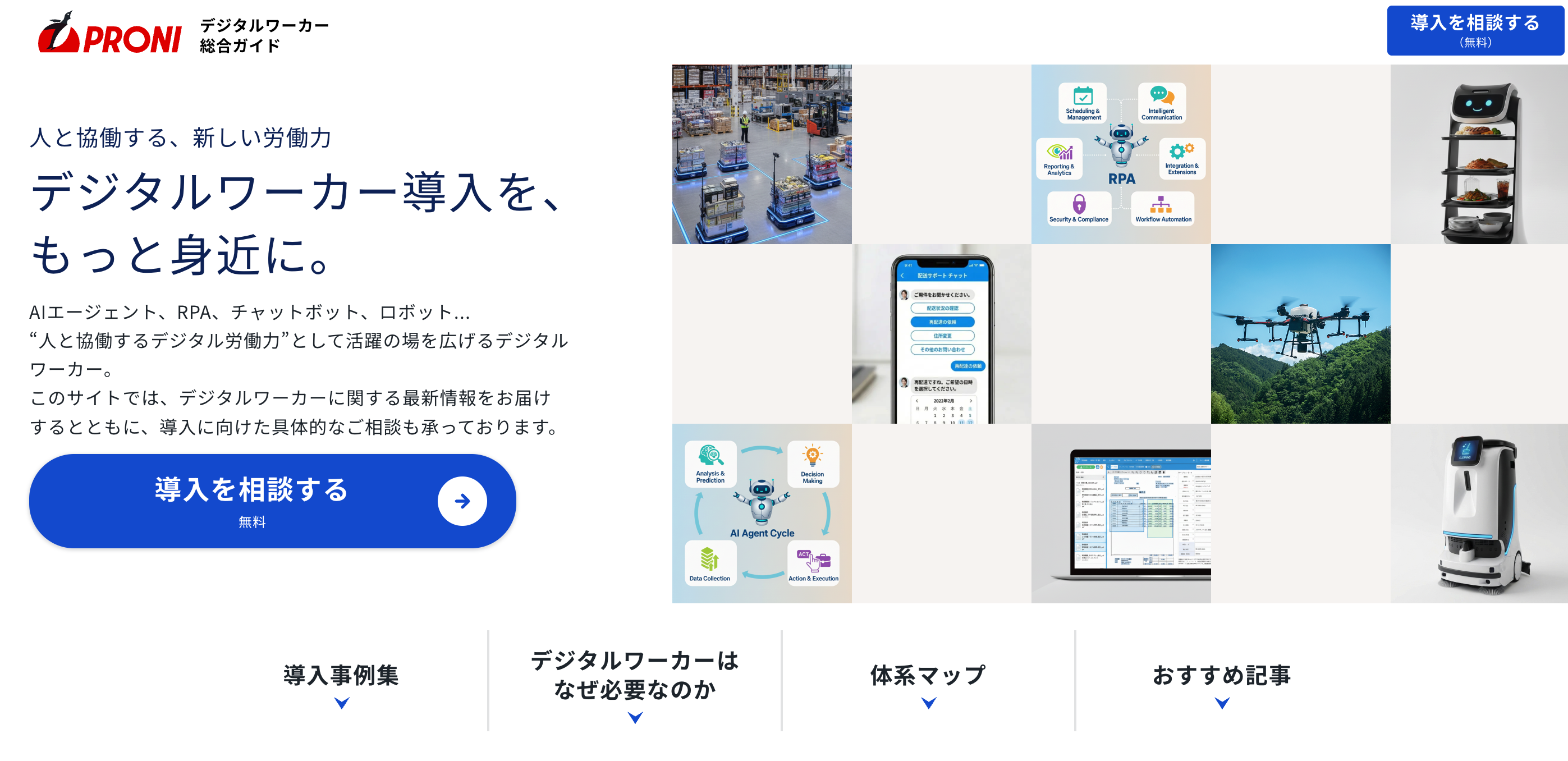 AI導入、人事業務、業界別など、企業課題に応じたテーマごとに最適なSaaSやソリューションを“迷わず選べる”よう設計されています。PRONIが保有するマッチング実績データと専門コンシェルジュの知見を活かし、ツール比較から導入支援までを一気通貫でサポート。DX推進の「最初の一歩」を、誰もがスムーズに踏み出せる社会の実現を目指しています。
